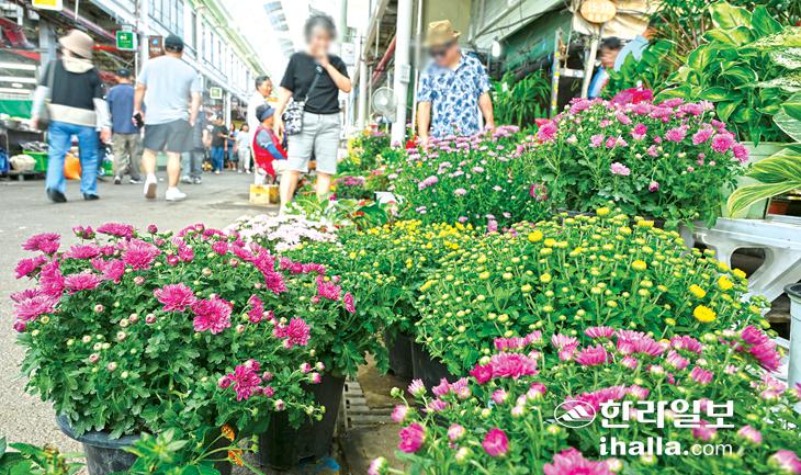 [한라일보] 12일 제주시 민속오일시장에 국화꽃이 진열돼 오일장을 찾은 시민과 관광객들의 눈길을 사로잡고 있다. 강희만기자