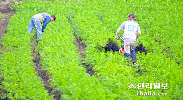[한라일보] 13일 제주시 구좌읍 송당리 한 당근밭에서 농민들이 농경지 다지기 작업을 하고 있다. 강희만기자
