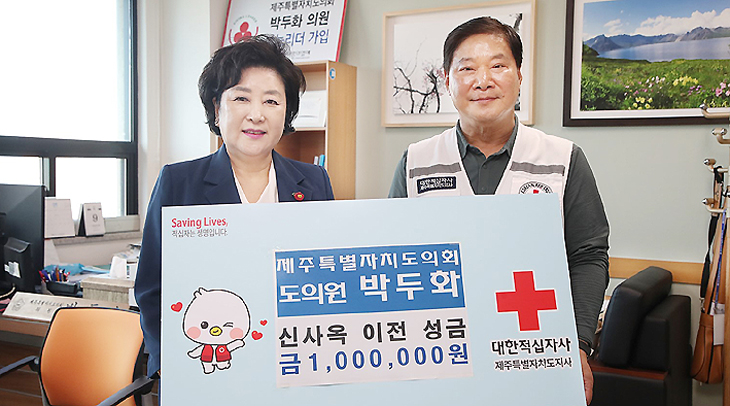 박두화 제주특별자치도의회 의원은 지난 13일 대한적십자사 제주특별자치도지사(회장 정태근)에 신사옥 이전 성금 100만원을 기탁했다.