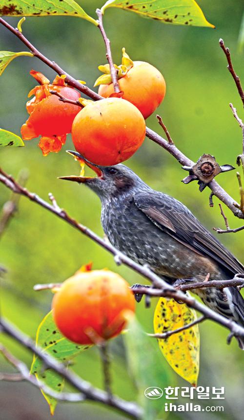 [한라일보] 14일 제주특별자치도청 정원 감나무에 배고픈 직박구리가 찾아와 잘 익은 홍시로 만찬을 즐기고 있다. 강희만기자
