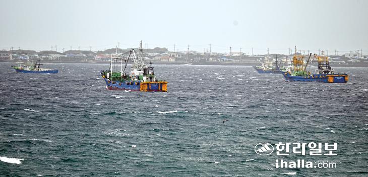 [한라일보] 15일 제주시 구좌읍 종달리 앞바다에 제주해상에서 조업 중이던 어선들이 피항해 정박해 있다. 강희만기자