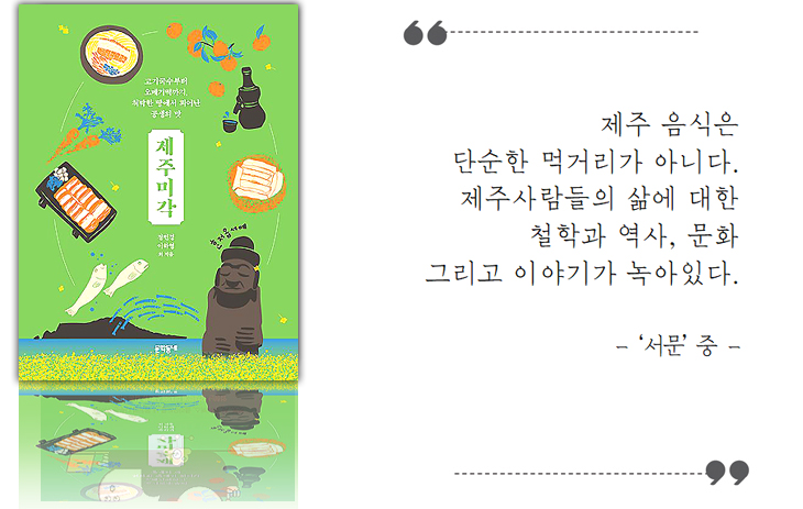 제주 음식에 깃든 제주사람들의 삶에 대한 철학과 역사, 문화를 들여다본다. 고지영·김규태·김민경·김서영·김은희·문성호·안영실·이진영·이가영·이하영·정민경 등 제주가 고향이거나 제주에서 오래 살아온 인문학자 11명이 제주의 옛 문헌과 자신의 경험을 바탕으로 제주음식에 대한 이야기를 풀어낸 '제주미각'이다.