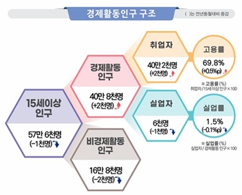 취업자 산업별로는 전기·운수·통신·금융업에서 6000명, 도소매·숙박·음식점업도 6000명이나 증가했다. 반면 건설업은 전년보다 7000명이나 줄어 침체를 벗어나지 못했다. 지위별로는 임시근로자 1만명, 상용근로자 2000명이 증가했고 일용근로자는 5000명, 자영업자 3000명, 무급가족종사자도 2000명 줄어 고용형태에서도 긍정적인 모습을 보였다.