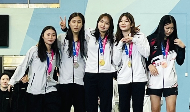 제주선수단 첫 금메달을 안긴 김민선(남녕고1, 왼쪽에서 세번째)과 이예주(남녕고2, 네번째).