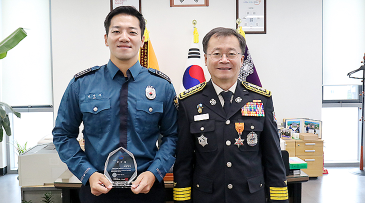 서귀포소방서(서장 고정배)는 21일 서귀포시 중문해수욕장 수난사고 현장에서 인명을 구한 강영호 씨와 김양재 경사(서귀포경찰서 소속)에게 감사패를 수여했다.
