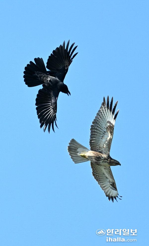 [한라일보] 22일 제주시 한림읍 상공에서 말똥가리와 큰부리까마귀가 영역 다툼을 하고 있다. 강희만기자