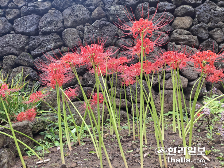 다시 해안의 미끄러운 바위를 조심스레 걸었다. 머릿속은 과거의 역사를 기억하며 깊은 상념에 빠져들었다. 어느 곳 하나 성하지 않았던 제주의 땅 그리고 역사…. 화북 포구로 접어드는 바닷길 가장자리에는 비 맞은 작은 들꽃들과 어우러진 숨비기나무 꽃망울이 영롱하다. 들꽃이 마음에 드는 까닭은 꽃의 색이 고운 때문만은 아니다. 꽃이 선명한 색을 발현하는 것은 성장과정에서 환경적 고난과 변화를 모두 품은 결실임을 안다. 고난의 역사를 이겨낸 제주인 들도 그러하다.