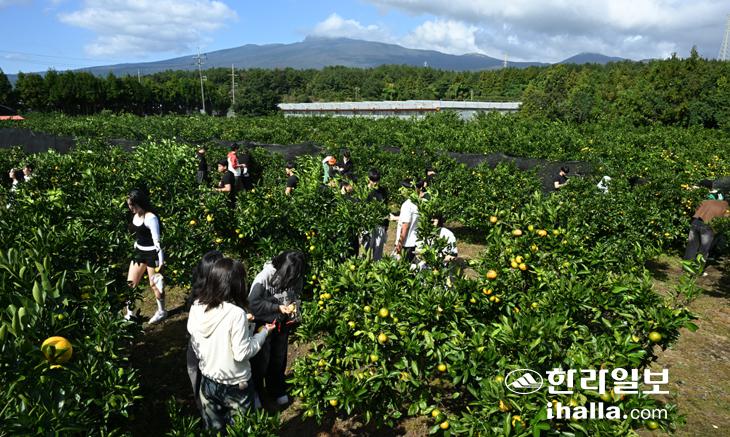 [한라일보] 23일 서귀포시 남원읍 휴애리자연생활공원 감귤체험장을 찾은 수학여행단 학생들이 제주에서만 즐길 수 있는 감귤따기 체험을 하고 있다. 강희만기자