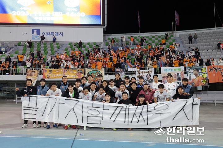 25일 수원FC와의 원정경기에서 2-1로 승리를 거두며 10경기 무승에서 탈출한 제주SK 선수단이 기념사진을 촬영하고 있다. 한국프로축구연맹 제공