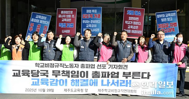 [한라일보] 제주지역 학교 비정규직 노동자들이 28일 정부와 제주도교육청에 저임금과 차별 문제 해소를 요구하며 다음달 총파업을 예고했다.