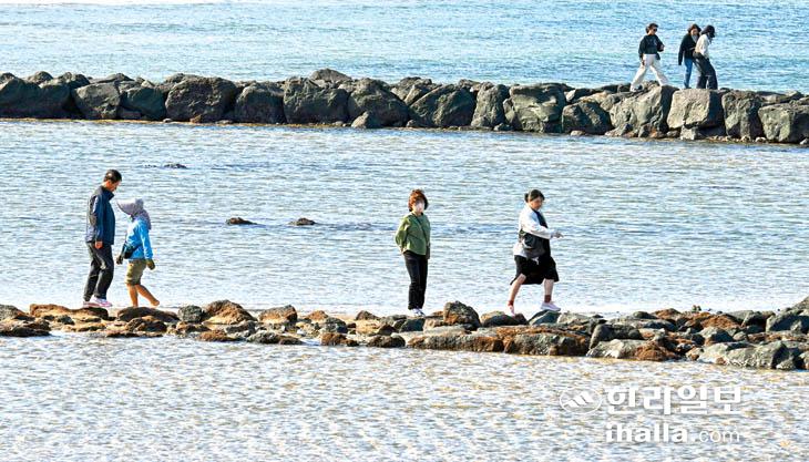 [한라일보] 29일 제주시 이호해수욕장을 찾은 관광객들이 썰물에 드러낸 원담 위를 걷고 있다. 강희만기자