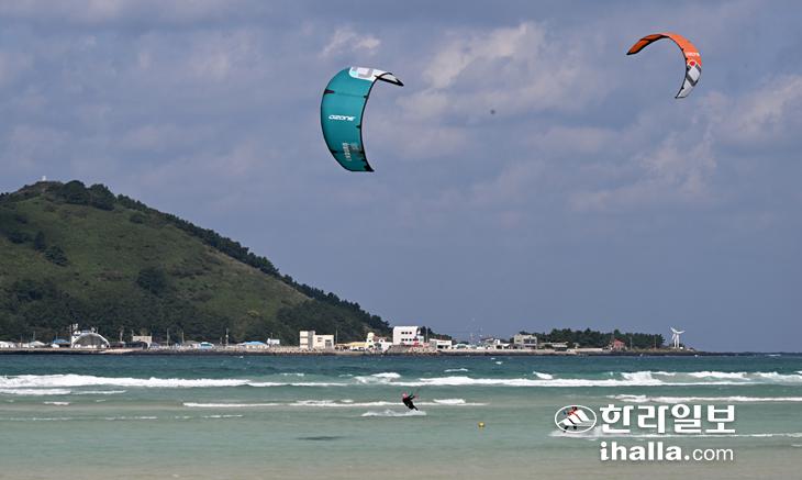 [한라일보] 1일 제주시 한림읍 금릉 앞바다를 찾은 수상레저객들이 섬속의 섬 비양도를 배경으로 카이트서핑을 즐기고 있다. 강희만기자