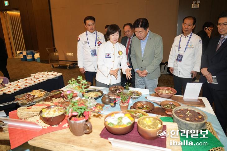오영훈 지사가 지난 2일 제9회 향토음식품평회 및 세계조리사연맹(WACS) 국제요리경연대회 행사장을 둘러보고 있다. 제주도 제공