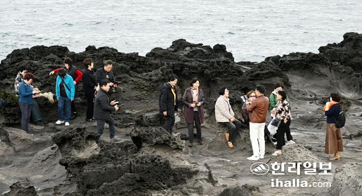 [한라일보] 4일 제주시 용두암 해안도로 갯바위를 찾은 관광객들이 사진을 찍으며 제주에서의 추억을 새기고 있다. 강희만기자