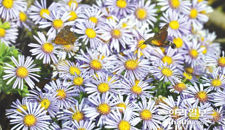 [한라일보] 4일 서귀포시 성산읍 해안가에 가을의 절정을 알리는 해국이 만개하자 박각시나방이 찾아와 꿀을 따먹고 있다. 강희만기자