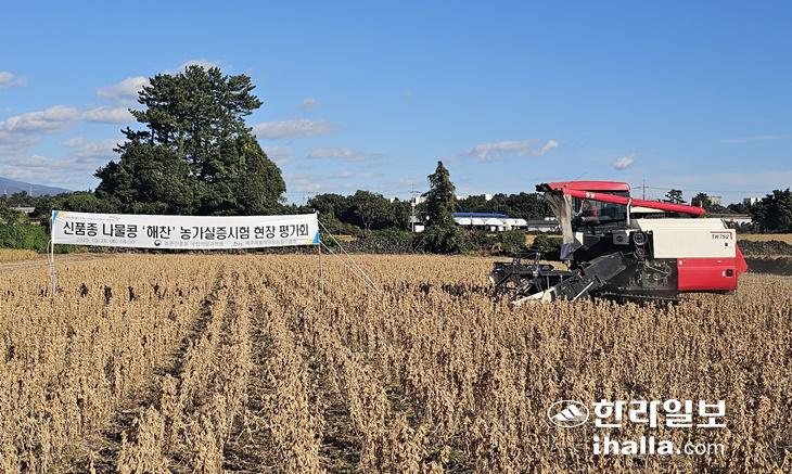 신품종 나물콩 '해찬' 실증 농가에서 기계 수확 시연을 하고 있다. 제주도 제공