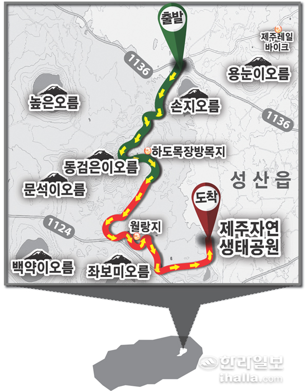 [한라일보] 연휴 내내 찌뿌둥하던 하늘이 환하게 열린 주말. 쾌청한 초가을 날씨를 만끽하며 길을 나섰다. 지난 11일 진행된 '2025 제주섬 글로벌 에코투어'는 옛적 '테우리'가 다니던 길을 따라 초지와 오름, 곶자왈 지대를 누비는 시간이었다. 빈자리 하나 없이 꽉 찬 버스가 어느새 구좌읍 하도 목장에 닿았다.