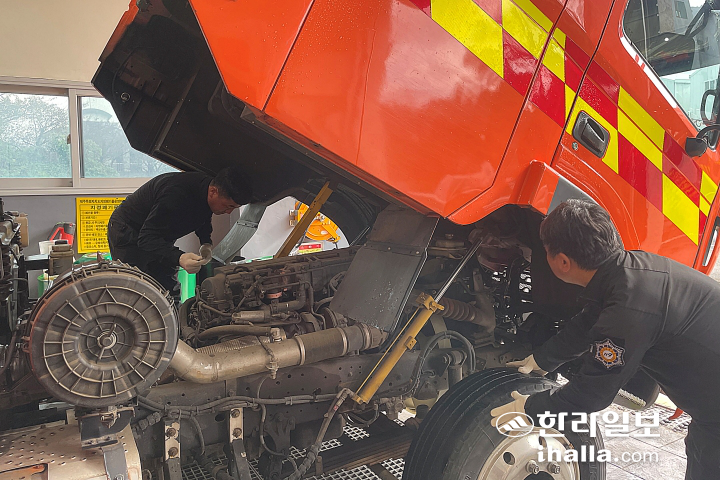 소방관 2명이 도 전역 소방차량·장비 점검 및 정비