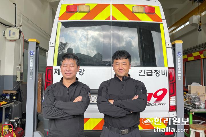 제주 소방장비 정비 교육센터에 최초로 임용됐던 나병문 소방장(왼쪽, 현 애월119센터장)과 진영범 소방장.