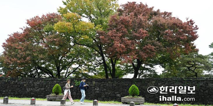 [한라일보] 9일 제주시 오현단 제주성에 식재된 나무들에 울긋불긋 단풍이 내려 앉았다. 고운 빛깔로 변신하는 단풍 만큼이나 가을은 시나브로 깊어가고 있다. 강희만기자