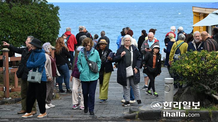 [한라일보] 쌀쌀한 날씨를 보인 9일 많은 외국인관광객들이 제주시 용두암을 찾아 주변을 둘러보고 있다. 강희만기자