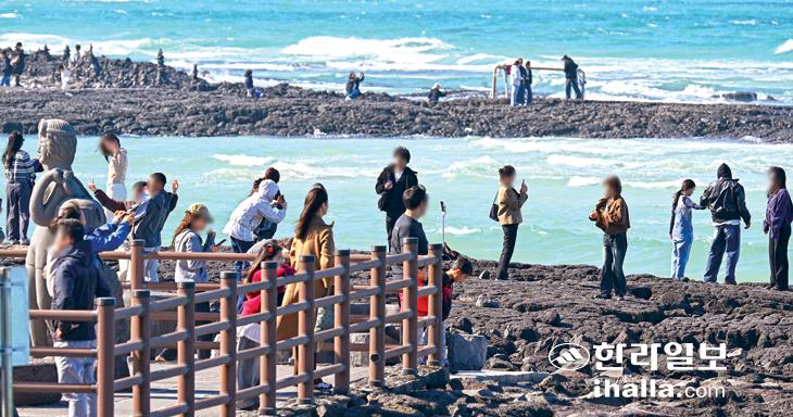 [한라일보] 10일 제주시 한림읍 협재해수욕장을 찾은 관광객들이 늦가을 제주바다 경치를 즐기고 있다. 강희만기자