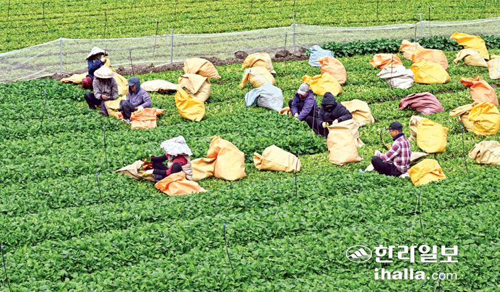 [한라일보] 쌀쌀한 날씨를 보인 12일 제주시 애월읍 한 농경지에서 농민들이 취나물 수확 작업을 하고 있다. 강희만기자