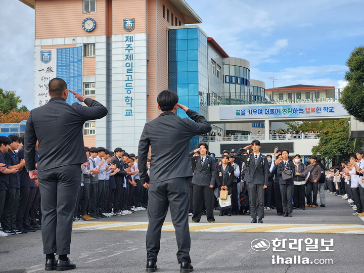 제주제일고등학교는 지난 12일 제70기 학생자치회 주관으로 전통 행사인 '수능 응원길(제일의 바람길)'을 열었다. 1, 2학년 후배들은 응원 구호와 응원가 '차돌가'를 제창하며 선배들에게 힘을 전했다.