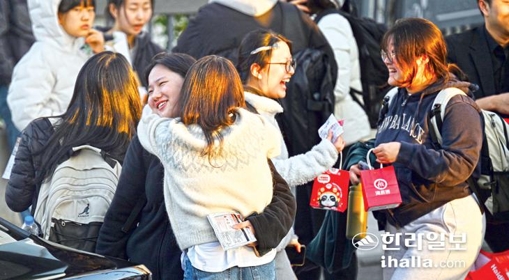 13일 오후 수능을 치르고 시험장 밖으로 나온 수험생들이 고생했다며 서로 껴안아주고 있다. 강희만기자