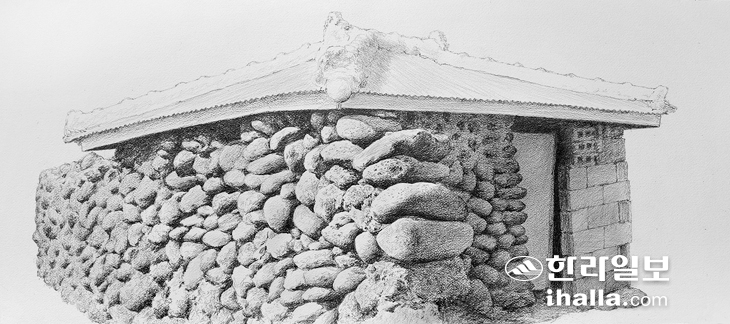 내도마을의 풍토성을 대표적 상징성으로 보여줄 수 있는 존재를 찾아 며칠을 돌아다니다가 만난 장면이다. 화산섬이 풍부하게 제공하는 현무암을 통해 선조들은 밭담이며 집담들을 쌓고 삶을 영위했다. 통상적으로 보게 되는 돌담과 전혀 다른 이 놀라운 돌쌓기를 경이로움으로 마주했다. 돌을 쌓아본 사람이면 모두 알겠거니와 면과 면이 맞닿아야 그 무게와 균형에 의해 쌓임이 안정적으로 진행된다. 그런데, 저런 둥글둥글한 돌들로 쌓기 구조체를 형성하다니 그저 놀라울 뿐. 수천, 아니 수만년을 하천과 바다가 만나는 곳으로 냇가를 통해 굴러온 돌들이 둥글게 마모돼 지천에 널려 있느니 그것을 건축자재로 쓴 것이다. 환경의 지배를 받은 것이 아니라 환경을 이용할 기술력을 확보하기 위해 노력했다고 봐야 할 것이다. 늦가을 햇살이 돌담의 둥글고 매끈한 면에 내리쬐니 경이로운 존재감이 생성된다. 분면 구조적으로 위태로운 저 쌓임에 대해 존경심을 가지고 그려나갔다. 연필소묘를 선택한 이유 또한 간명하다. 명도 자체에서 주제를 부각하기 위한 선택. 처음에는 초가집이었을 터. 새마을운동 시기에 슬레이트 지붕으로 바꾸고 세월이 흘러 한쪽 귀퉁이를 시멘트 블록으로 쌓았다. 참으로 극명한 대비다. 마을 곳곳에 이런 돌들로 쌓은 밭담이며 집담을 만날 수 있는 곳. 현무암으로 공공미술 작업을 해온 필자로서는 귀한 수석들로 지은 집으로 보인다. 이를 금액으로 환산하면 집 자체가 부자다. 다른 곳에서 만날 수 없는 문화재적 가치.