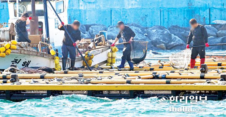 [한라일보] 13일 서귀포시 대정읍 운진항 내 가두리장에서 어민들이 방어 출하작업을 하고 있다. 강희만기자