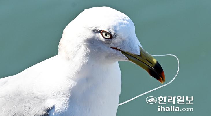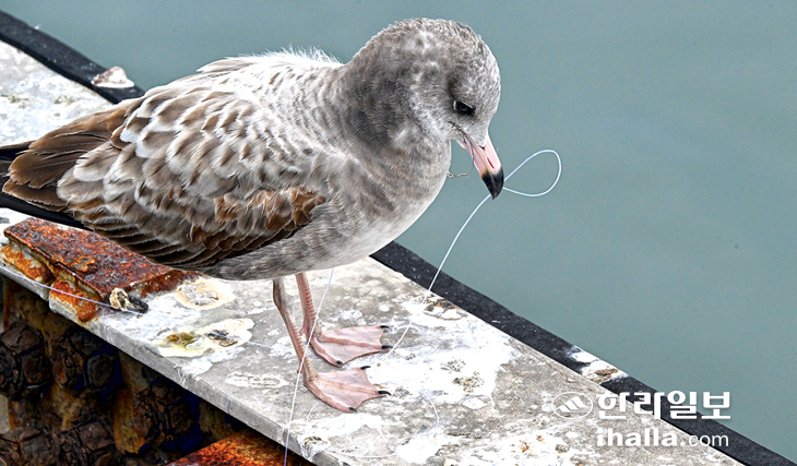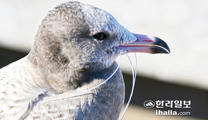 [한라일보] 제주시 한림항을 찾은 괭이갈매기 중 상당수가 낚싯줄에 얽히거나 감기는 등 피해를 입은 모습이 포착돼 안타까움을 주고 있다. 강희만기자