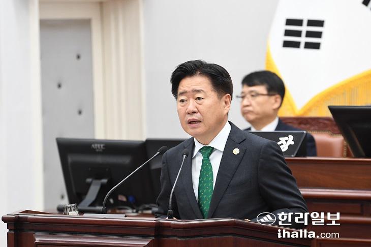 이날 열린 제주특별자치도의회 제444회 제2차 정례회 도정질문에서 양용만 의원(국민의힘, 한림읍)은 "고수온으로 인한 양식장 피해가 지난해에 이어 올해도 반복됐으며 현재 시행 중인 액화산소 공급과 면역증강제 지원으로는 문제의 본질을 해결 수 없다"면서 "특히 서부권 양식장의 경우 안정적인 저수온 해수 공급이 절대적으로 필요하지만 (이 일대가) 2008년 지하수자원특별관리구역으로 지정돼 염지하수 개발에 사실상 제한을 받고 있다"고 지적했다.