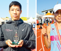 | 제21회 제주감귤국제마라톤 하프코스 남녀부 우승을 차지한 오준영과 최원이(왼쪽부터). 강희만 기자 |