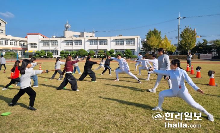 지난 6일 열린 한림초등학교의 '스포츠 데이' 펜싱 체험. 제주도 제공