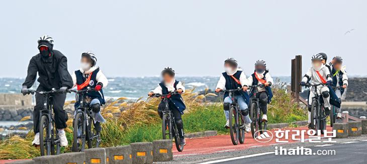 [한라일보] 17일 제주시 구좌읍 해안도로에서 어린이들이 늦가을 추위를 뚫고 자전거를 타고있다. 강희만기자