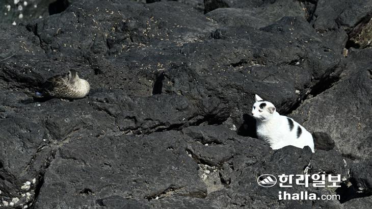 [한라일보] 18일 제주시 애월읍 금성리 해안 갯바위에서 휴식중인 흰뺨검둥오리를 배고픈 길고양이가 사냥을 하려는 장면이 포착됐다. 강희만기자