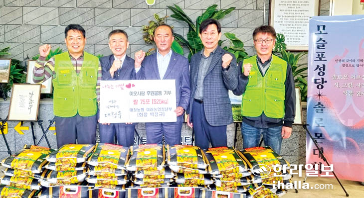 대정농협 미래농업청년부(회장 박정규)는 17일 서귀포시 대정읍(읍장 한분도)을 방문해 지역 내 소외된 이웃에게 따뜻한 마음을 전하기 위해 쌀 525㎏을 기탁했다.