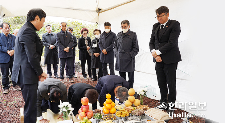 김창범 회장은 "후손들은 4·3의 가치가 세계의 보편적 평화와 인권의 가치로 승화될 수 있도록 매진할 것이니 안식처에 영면하시기를 기원드린다"고 했다.