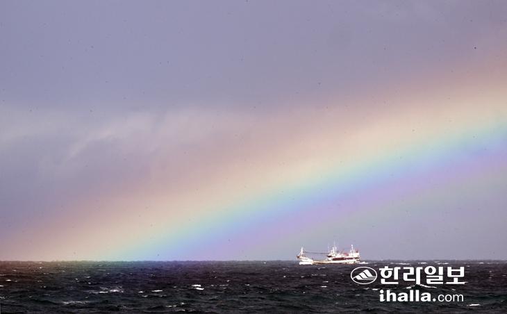 [한라일보] 19일 제주시 한경면 금등리 앞바다에서 한 어선이 주변에 나타난 무지개를 뚫고 항해하고 있다. 강희만기자