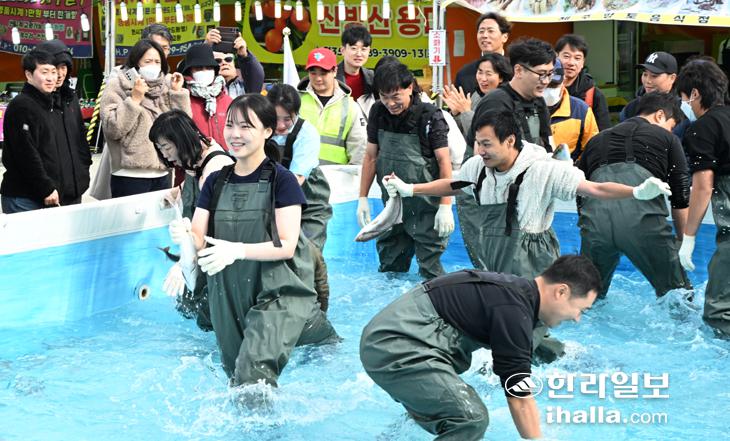 [한라일보] 20일 서귀포시 대정읍 모슬포항에서 개막한 제25회 최남단 방어축제 프로그램인 '방어 맨손잡기' 체험 참가자들이 방어를 잡고 기뻐하고 있다. 강희만기자