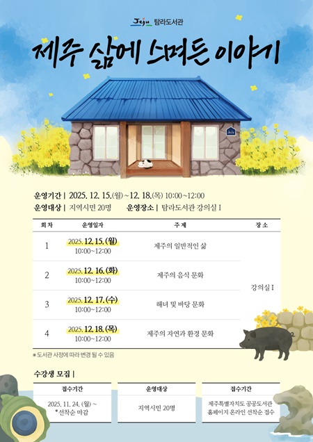 제주시 탐라도서관은 오는 12월 15일부터 18일까지 도서관 강의실에서 인문학 프로그램 '제주 삶에 스며든 이야기'를 운영한다.
