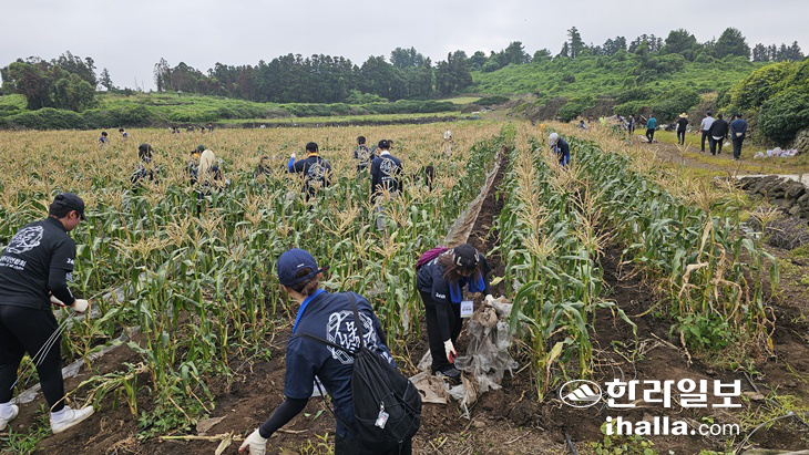 | 호남대 학생들이 초당옥수수 밭에서 폐비닐을 정리하고 있다. 제주도 제공 |