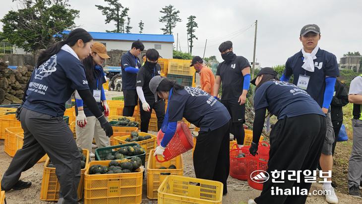 농케이션에 참여한 호남대 학생들이 제주시 애월읍 신엄리 농가에서 단호박 수확을 돕고 있다. 제주도 제공