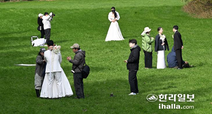 [한라일보] 26일 제주시 오등동 지역의 한 목장을 찾은 예비 신혼부부들이 결혼사진을 촬영하고 있다. 강희만기자