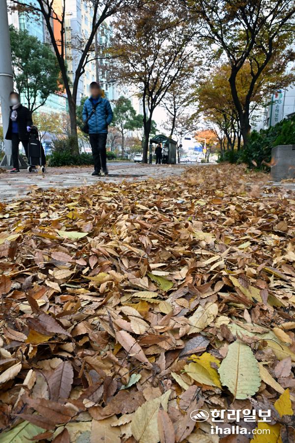 [한라일보] 초겨울 날씨를 보인 27일 제주시 노형동 신시가지 도로변에 가로수에서 떨어진 낙엽이 쌓여 계절의 변화를 알려주고 있다. 강희만기자