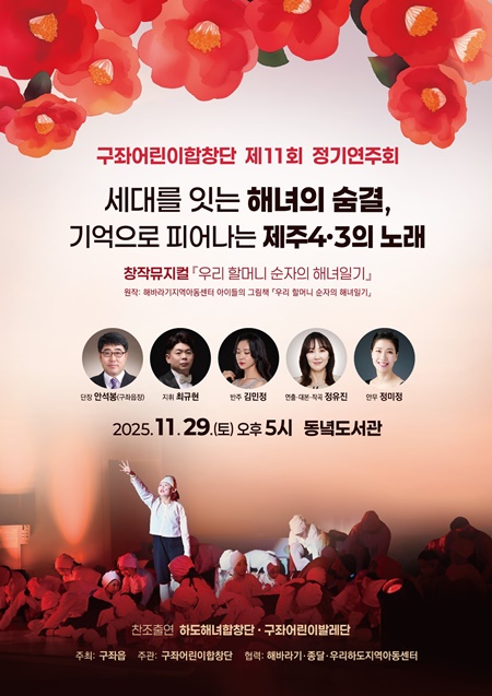 제주 구좌어린이합창단은 이달 29일 오후 5시 동녘도서관에서 세대를 잇는 해녀의 숨결, 기억으로 피어나는 제주 4·3의 노래'를 주제로 제11회 정기연주회를 연다.