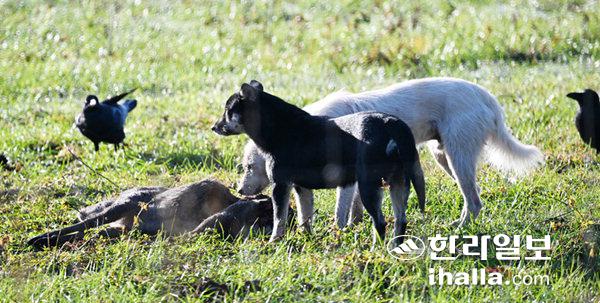 [한라일보] 제주도의 야생지난달 29일 제주시 조천읍 교래리 한 목장에서 들개 2마리가 노루를 사냥하는 모습을 큰부리까마귀가 지켜보고 있다. 강희만기자
