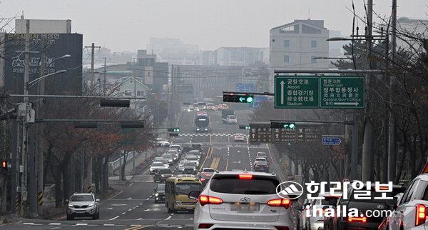 따뜻했지만… 미세먼지 ‘나쁨’1일 미세먼지 농도 '나쁨'을 보인 제주시 오라동 시가지가 뿌옇게 보인다. 강희만기자