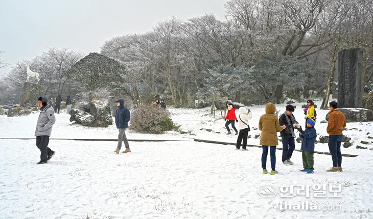 산지 대설주의보… 한라산 설경 즐기는 관광객들